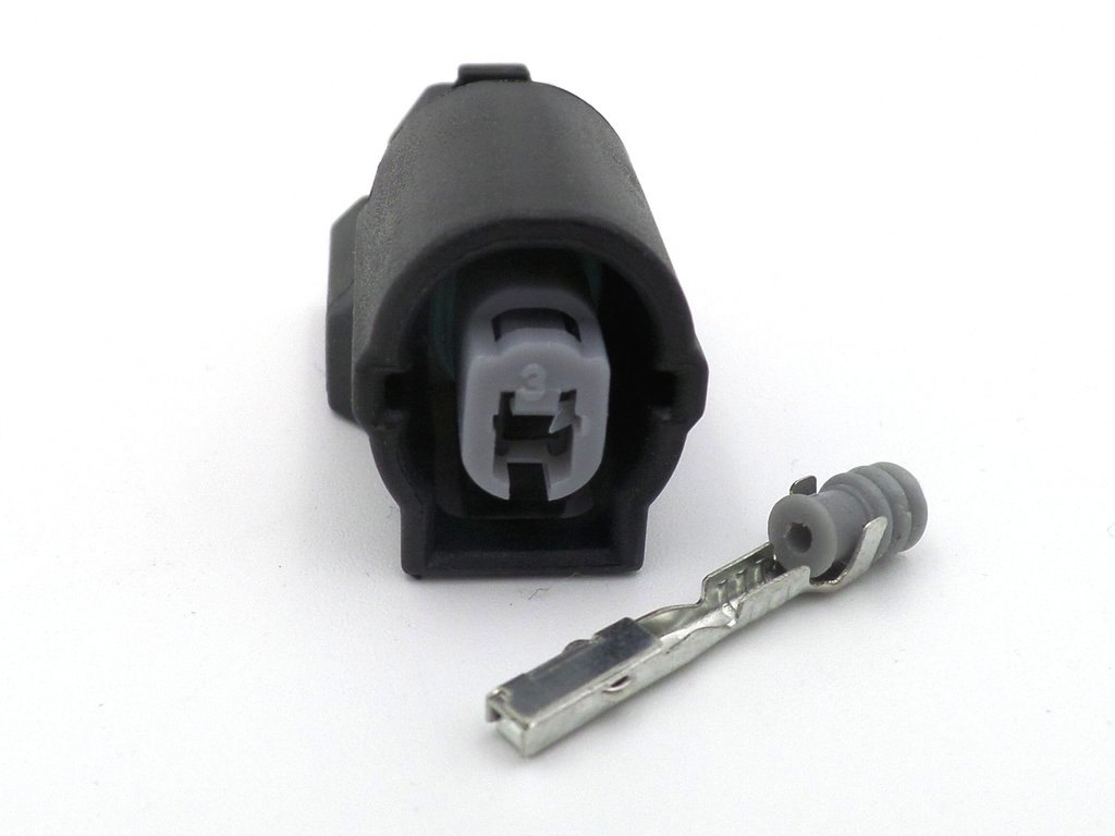 HX series 040 1 way female black sealed connector with grey terminal lock. Used on some Japanese motorcycles and other automotive vehicles.Â