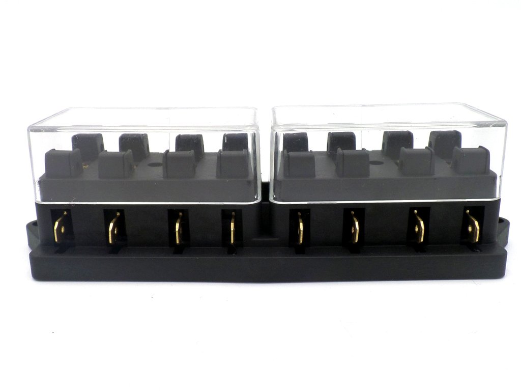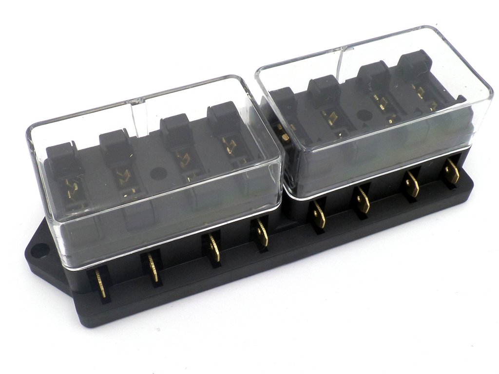 Fusebox 8 way automotive blade fuse holder. Uses 6.3mm female spade terminals for cable connection. L133 x W53 x H42 mm.